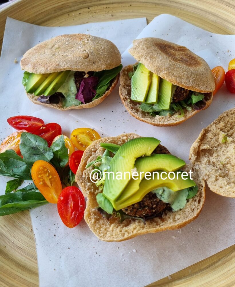 - Hamburguesa de quinoa con palta, hojas verdes en pan pita con salsa de cilantro